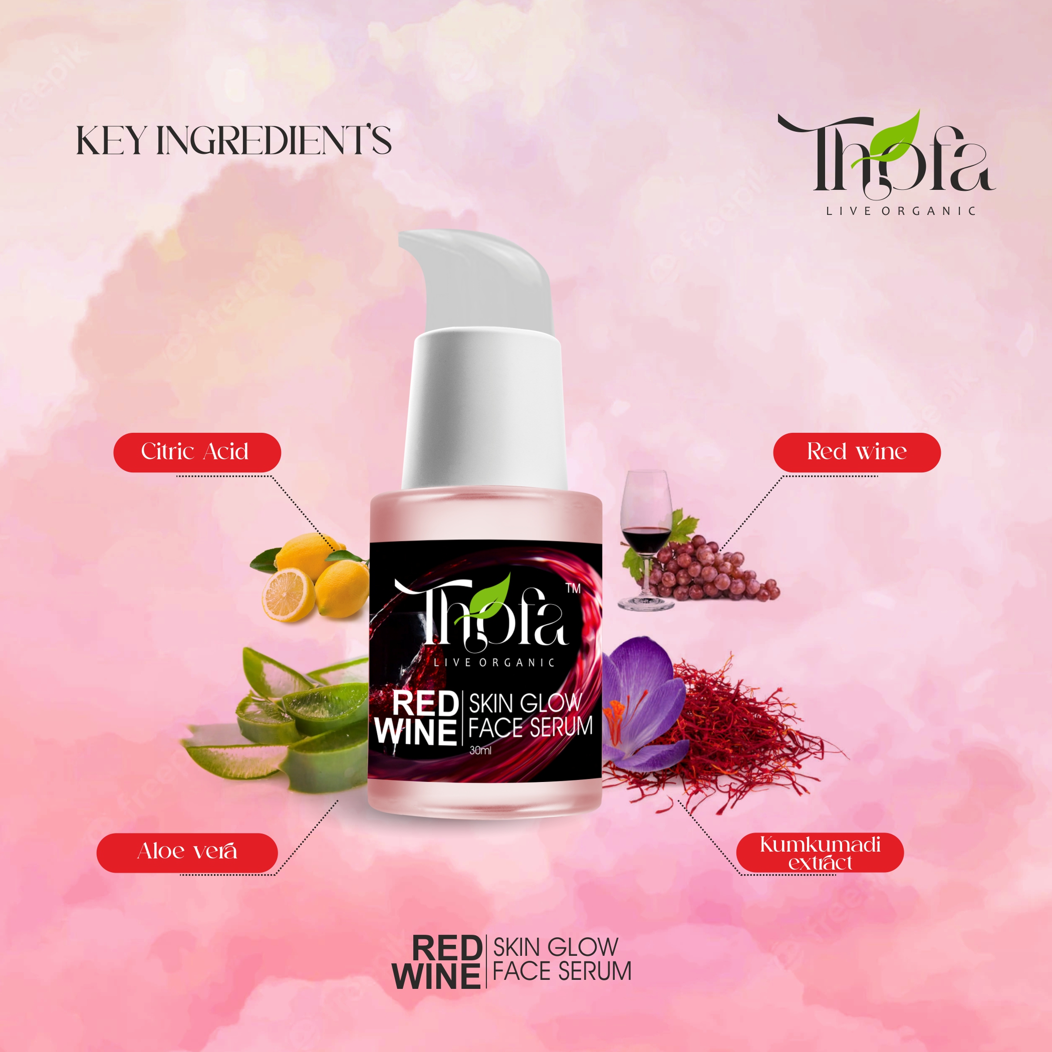 Thofa Red Wine Skin Glow Serum – Glowing Skin, Fights Acne With Red Wine, Citric Acid, Aloe Vera, Kumkumadi Extract 30ML